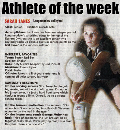 - 10/16/07 - Senior Outside Hitter Sarah janes name the Republican Newspaper Athlete of the Week. Click Here for Photo